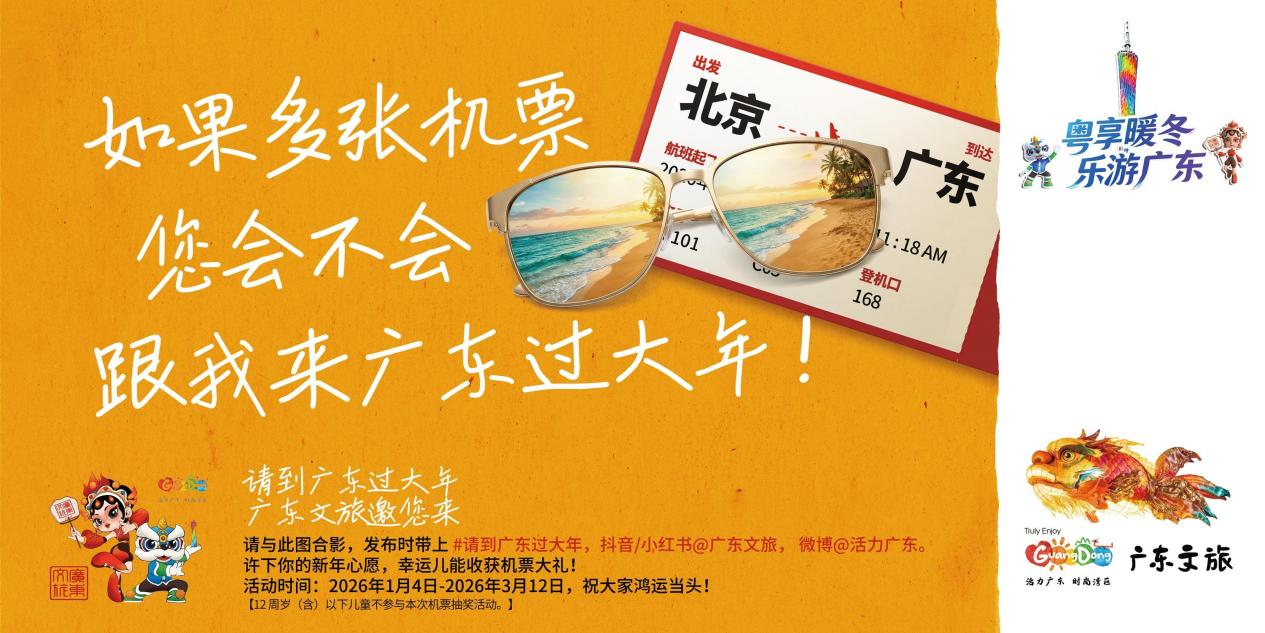 1月4日至3月12日,广东文旅联合航司推出机票赠送活动,市民游客可通过在北京、上海、哈尔滨机场以及北京、上海地铁线下打卡广东文旅宣传广告牌,发布活动相关的图文/短视频内容到个人社交媒体平台,带上话题#请到广东过大年,抖音或小红书 @广东文旅 ,微博@活力广东,参与者有机会获得北京/上海/哈尔滨飞往广州/深圳的机票。